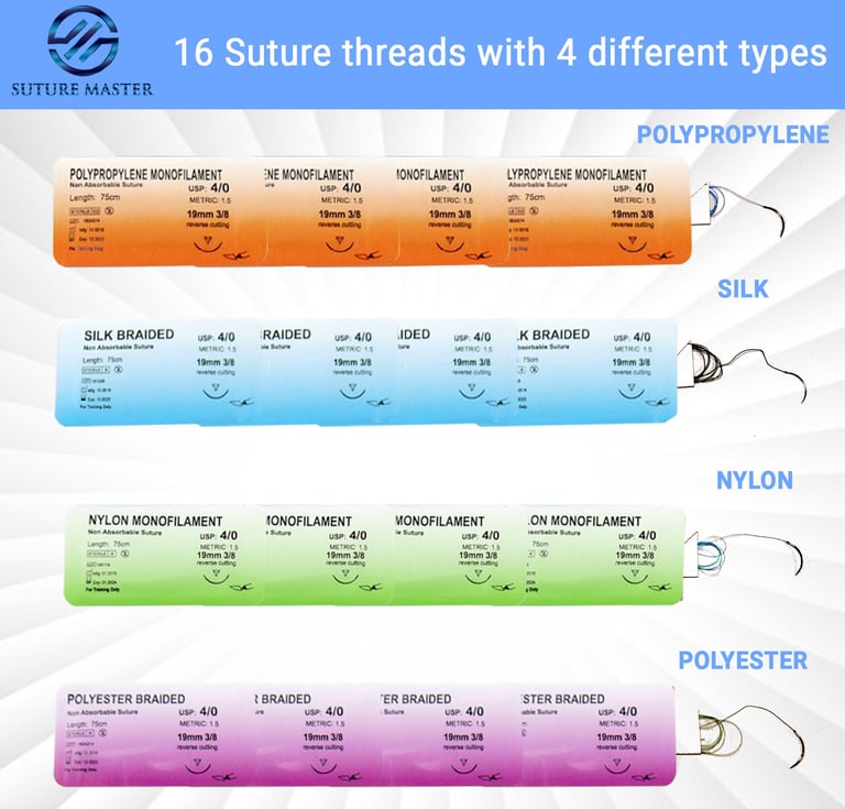 16 Suture Threads (4 Nylon, 4 Silk, 4 Polypropylene, 4 Polyester).